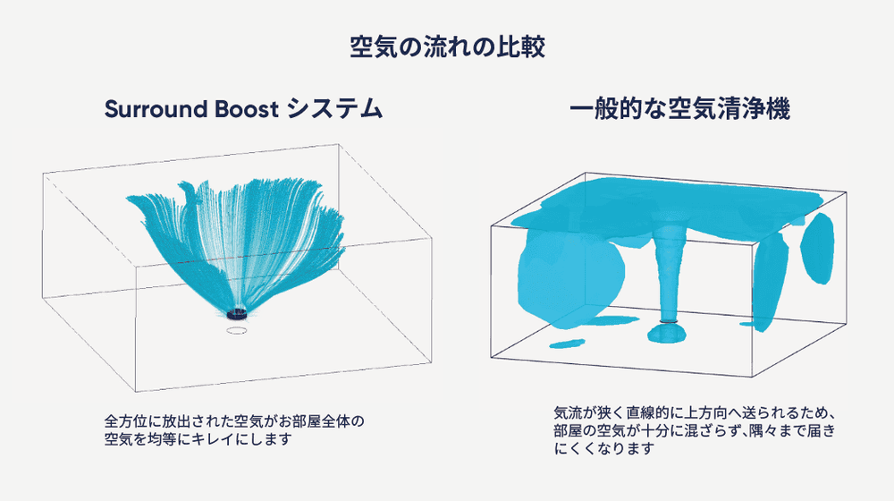 Blue Signature™ SP4iの大きな特長が、360°の吸引力と「Surround Boost」送風システムの組み合わせです。部屋のどこに置いても空気をまんべんなく吸い込み、中心から清浄な空気を優しく送り出します。