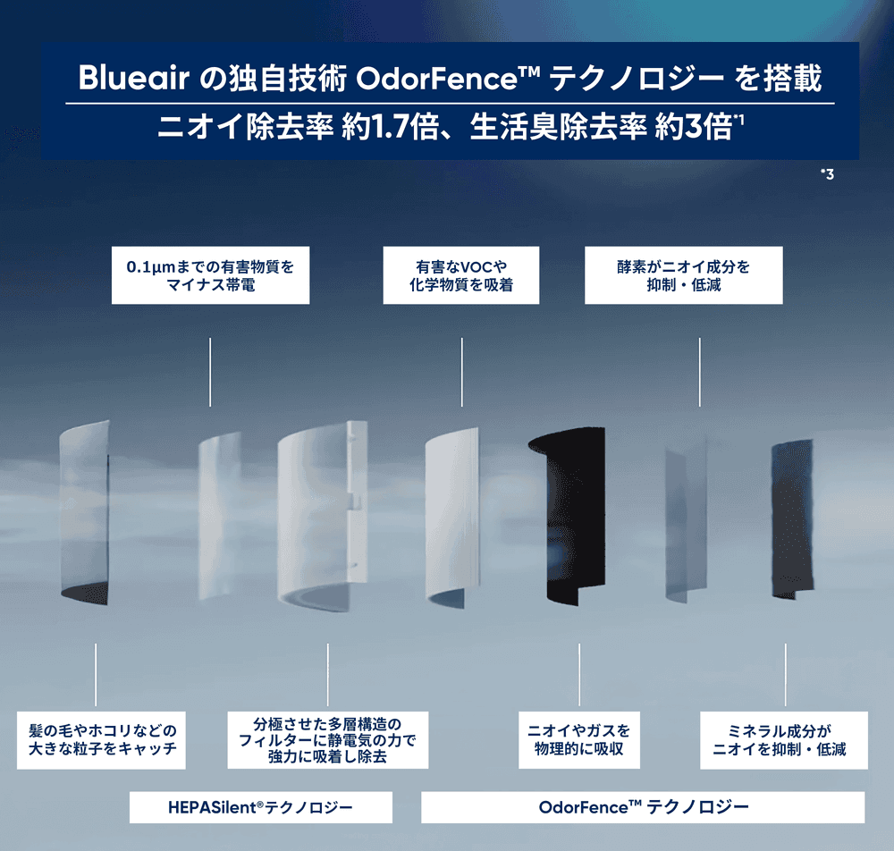 ●脱臭性能 OdorFence™ 搭載(生活臭を従来比最大3倍*¹除去)